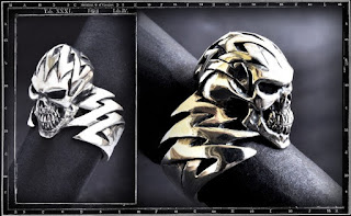 顎付きのスカルがリングに乗った、比較的コンパクトな造りの作品ですが、ライトニングボルトの鋭さに劣ることのない、鋭く厳つい顔つきのスカルは存在感充分です。